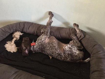 Senta was born in November in Michigan. She is a GSP ( german short haired pointer). We had to drive for 6 hours to get her, but obviously it was worth it. She is very curious and when she is tired she just likes to flop down on the couch.