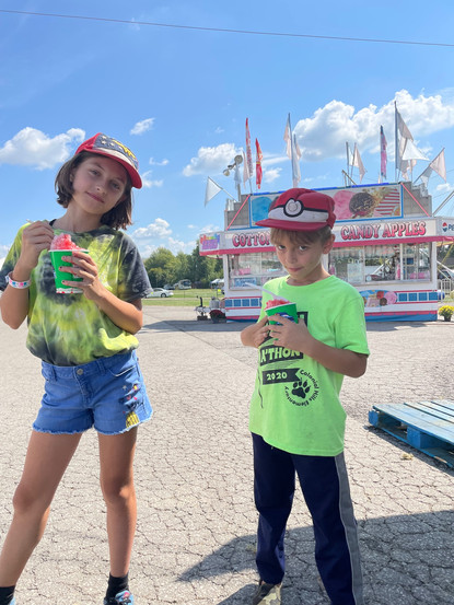 Hi everyone! Yesterday I went to the Delaware county fair with my cousins Liam, Kai and Grace, my grandparents and my my mom and brother. We got slushies and Kona ice (basically the same thing). I went on all the fastest rides, the hurricane, the tornado, the music express, the one I forget the name of that was my favorite. Yeah. Holden was really into playing those games that are usually real rip-offs. He actually won a sloth plush and a big soda plush. Oh, and we also saw a bunch of animals. Pigs, sheep, horses, chickens, rabbits, cows and turkeys. Yes, turkeys. So that's what happened. It was really fun! Stay safe and stay strong!